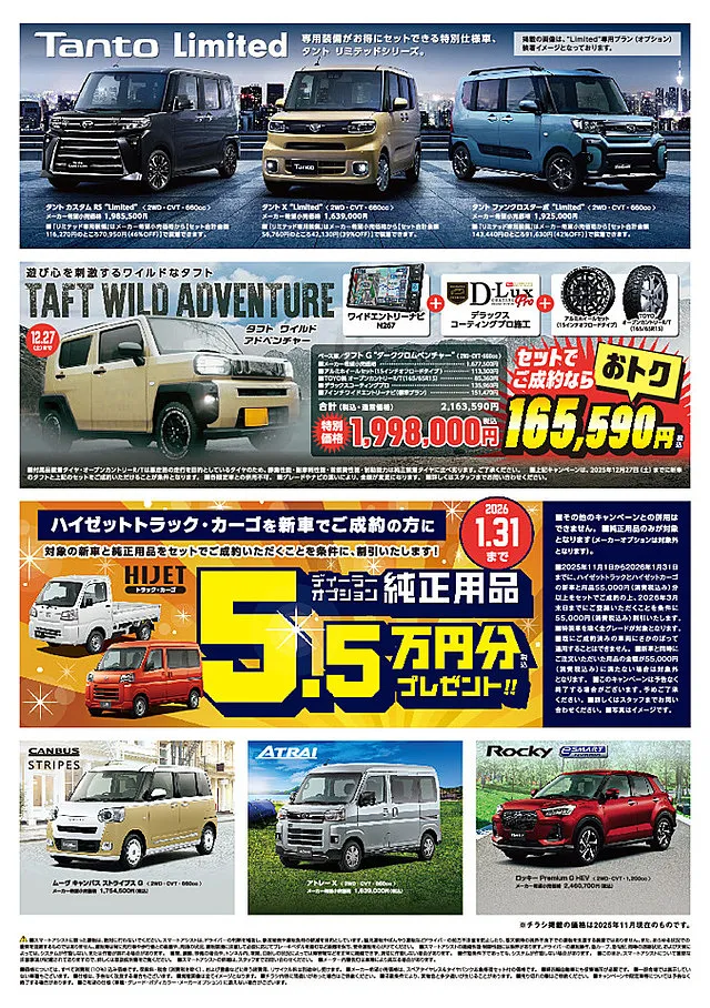 ■2025年11月1日から2026年1月31日までに、ハイゼットトラックとハイゼットカーゴの新車と用品55,000円(消費税込み)分以上をセットでご成約の上、2026年3月末日までに登録いただくことを条件に55,000円(消費税込み)割引いたします。