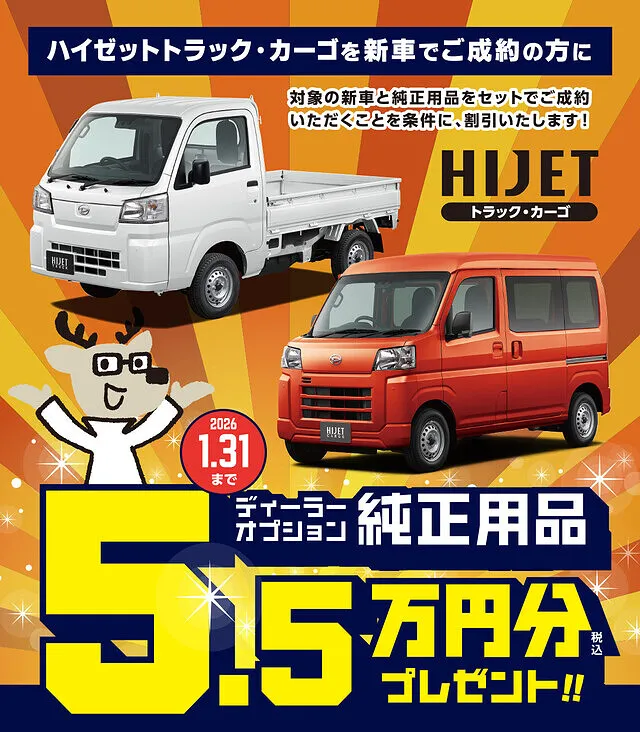 ■2025年11月1日から2026年1月31日までに、ハイゼットトラックとハイゼットカーゴの新車と用品55,000円(消費税込み)分以上をセットでご成約の上、2026年3月末日までに登録いただくことを条件に55,000円(消費税込み)割引いたします。